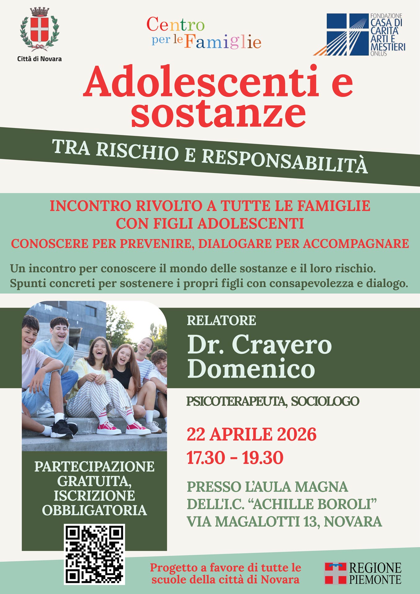 INCONTRO RIVOLTO A TUTTE LE FAMIGLIE CON FIGLI ADOLESCENTICONOSCERE PER PREVENIRE, DIALOGARE PER ACCOMPAGNARE Un incontro per conoscere il mondo delle sostanze e il loro rischio.Spunti concreti per sostenere i propri figli con consapevolezza e dialogo. RELATOREDr. Cravero DomenicoPsicoterapeuta, sociologo 22 APRILE 202617.30 – 19.30 PRESSO L’AULA MAGNA DELL’I.C. “ACHILLE BOROLI”Via Magalotti 13, Novara PARTECIPAZIONE GRATUITA, ISCRIZIONE OBBLIGATORIA Progetto a favore di tutte le scuole della città di Novara Regione Piemonte >>PER ISCRIZIONE ALL’EVENTO CLICCA QUI<< Documenti Poster jpeg - 334 kb